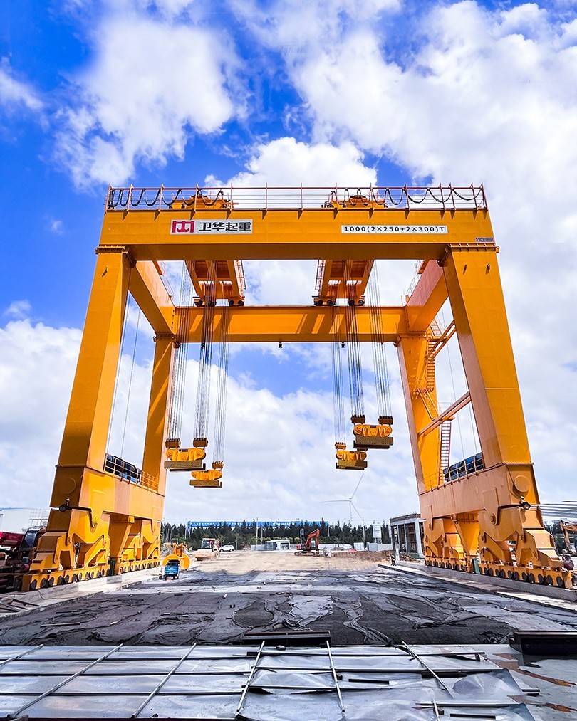 根据项目起吊重量大、工况复杂、控制精度高等特点,世界杯官方网站入口起重机采用U型门架结构,双龙门四点吊装,最大起吊重量1000t,最大吊点高度大于18m,采用变频+PLC控制,可实现横向、纵向距离可调,及吊梁自由旋转,控制精度达±1mm。