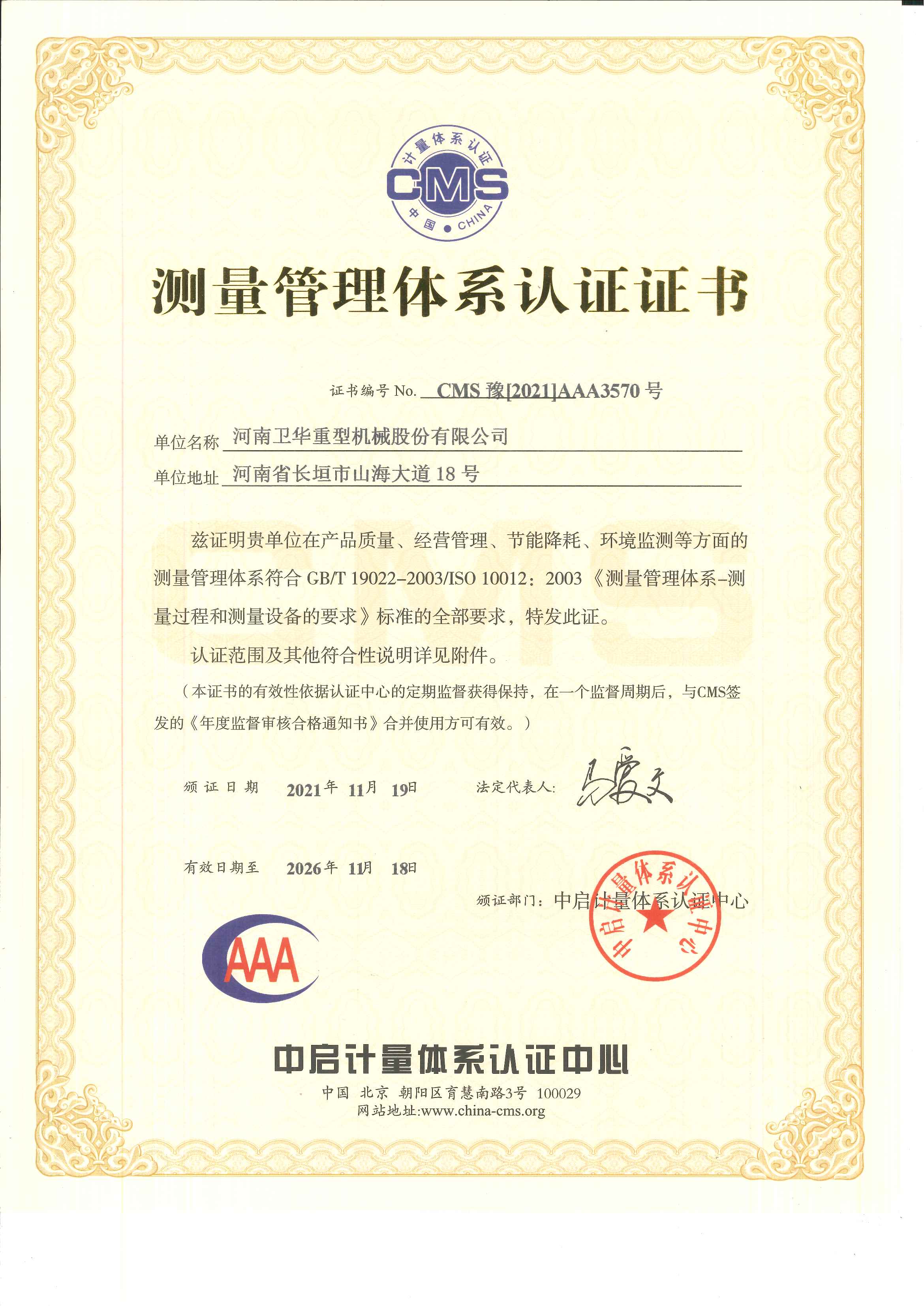 测量管理体系认证证书