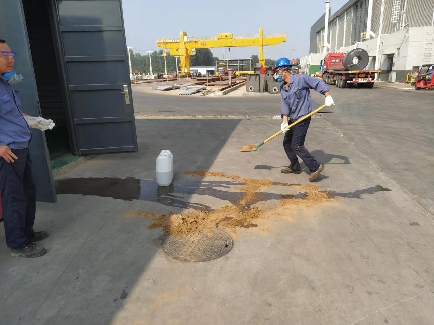 现场处置人员身穿劳动防护器具及处置工具赶赴现场,到达现场后,首先拉起警戒线,随后利用铁锹、沙土等救援物资对泄漏的废油进行围堵处理,其他增援人员准备好灭火器对准泄漏区域,应对可能突发火险的状况。
